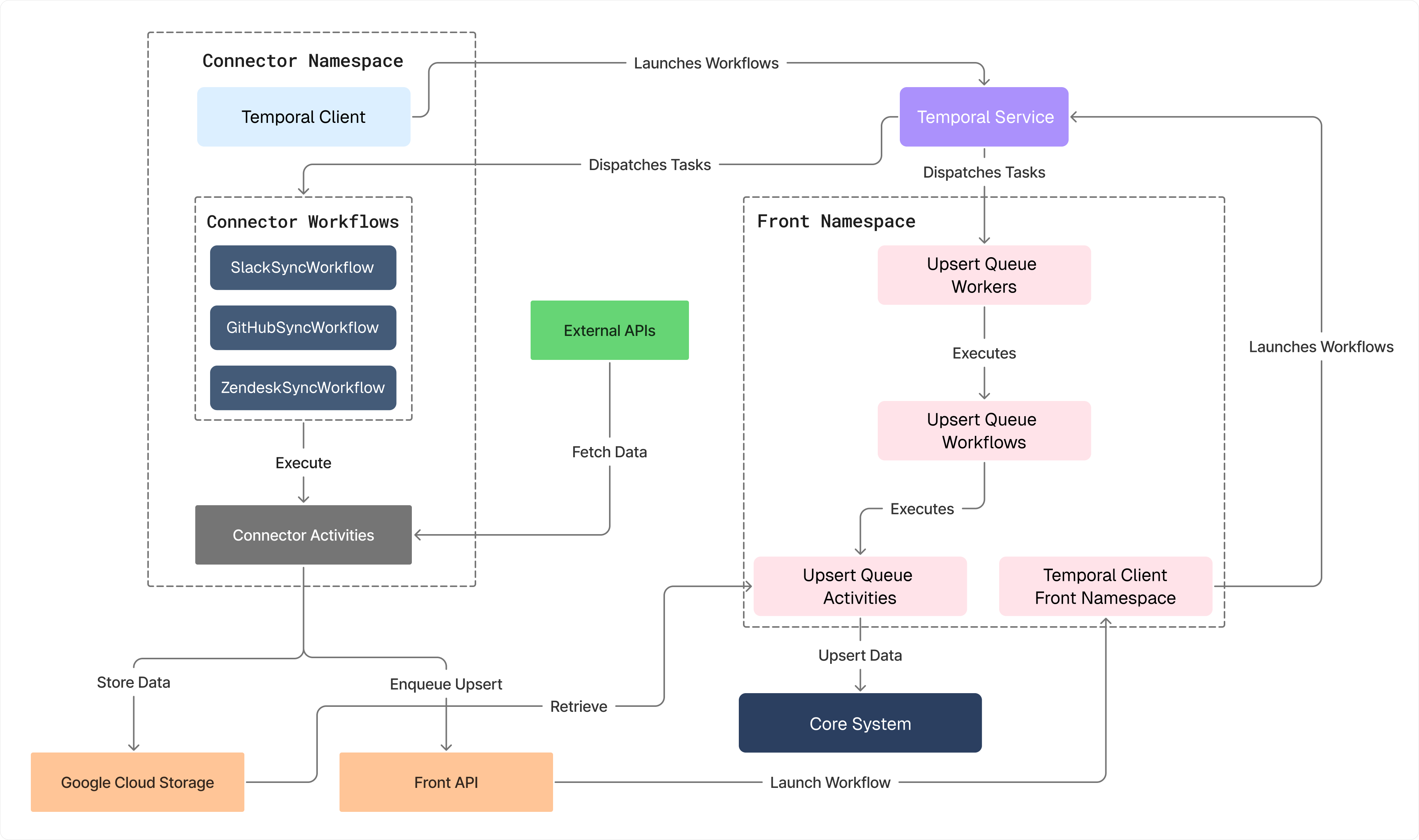 The diagram below shows how Dust uses Temporal as the backbone of its orchestration system.