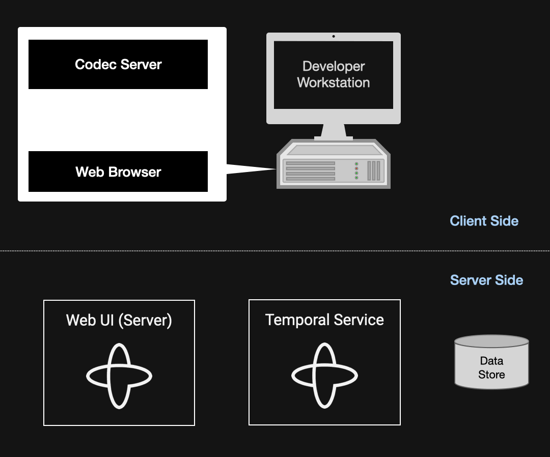 A Codec Server gives you the best of both worlds. It’s a simple application that you write and run on a machine you control, and it makes your Payload Codec available over HTTP. You configure the Temporal Web UI to use it, and when you view a page containing data encoded by your Payload Codec, JavaScript in your browser passes the encoded data through your Codec Server and then displays it to you. The decoding happens entirely on the client side, so neither the Temporal Service nor the server-side components of the Temporal Web UI are involved in this communication.