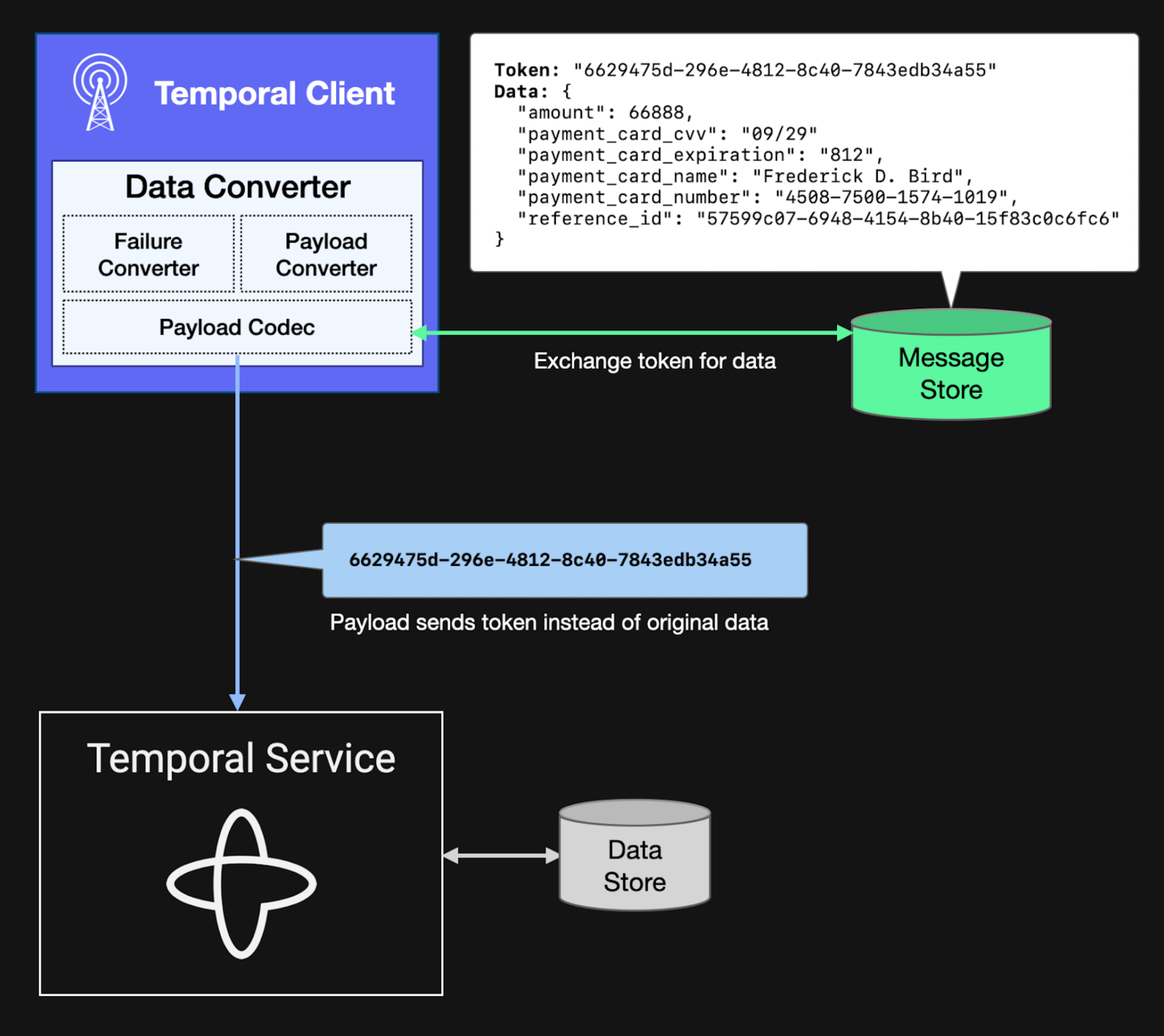 - Replacing sensitive data with a token: An alternative to encryption is to use a Payload Codec to replace the actual payload with a token, such as a UUID, before sending it, and then replacing the token with the original payload upon receipt. This can be an effective solution, although the developer must take care to design the system used to map tokens to payloads so that it does not negatively affect overall performance and availability.