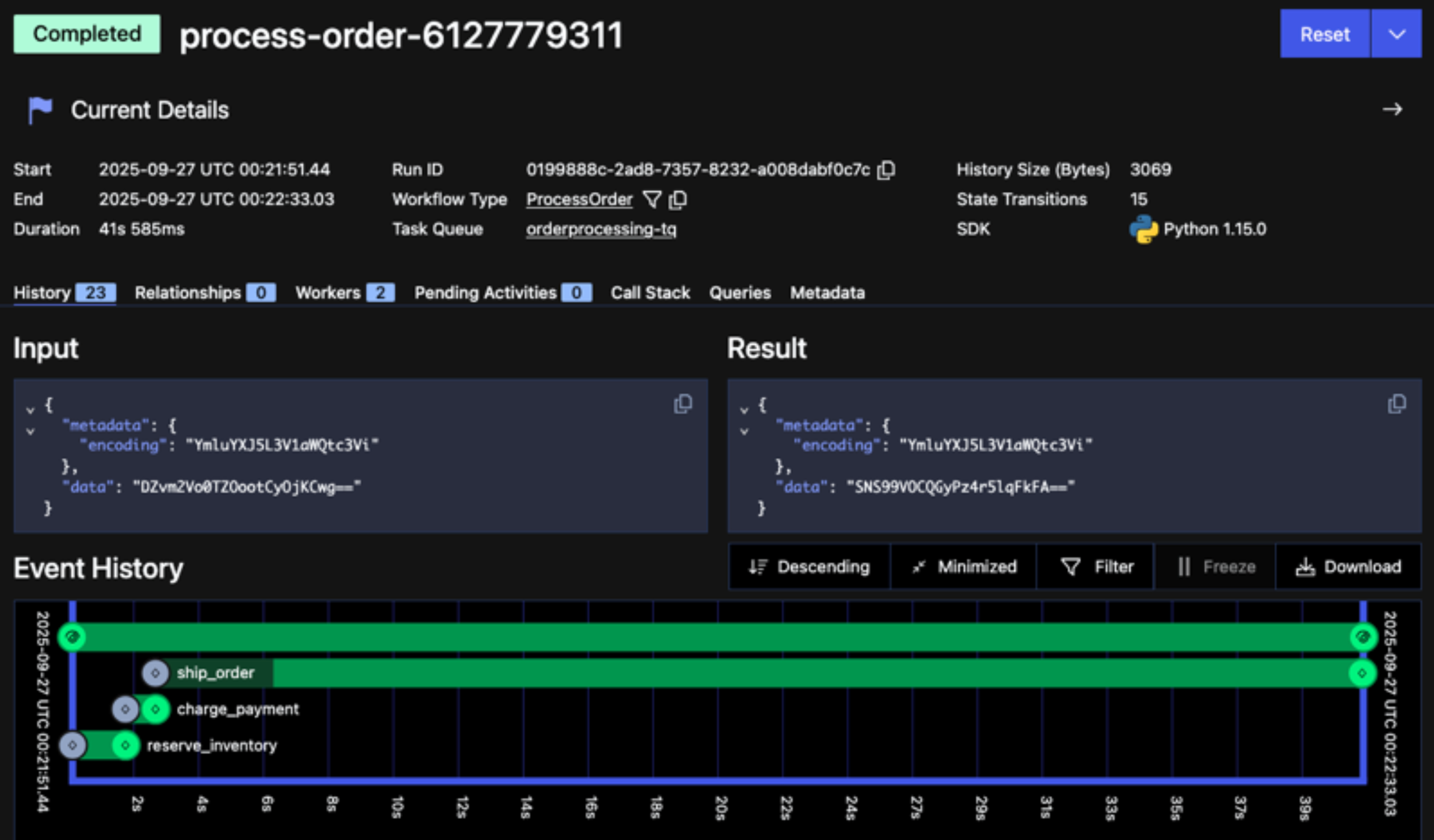 $ temporal workflow result --workflow-id process-order-6127779311 --codec-endpoint http://localhost:8081