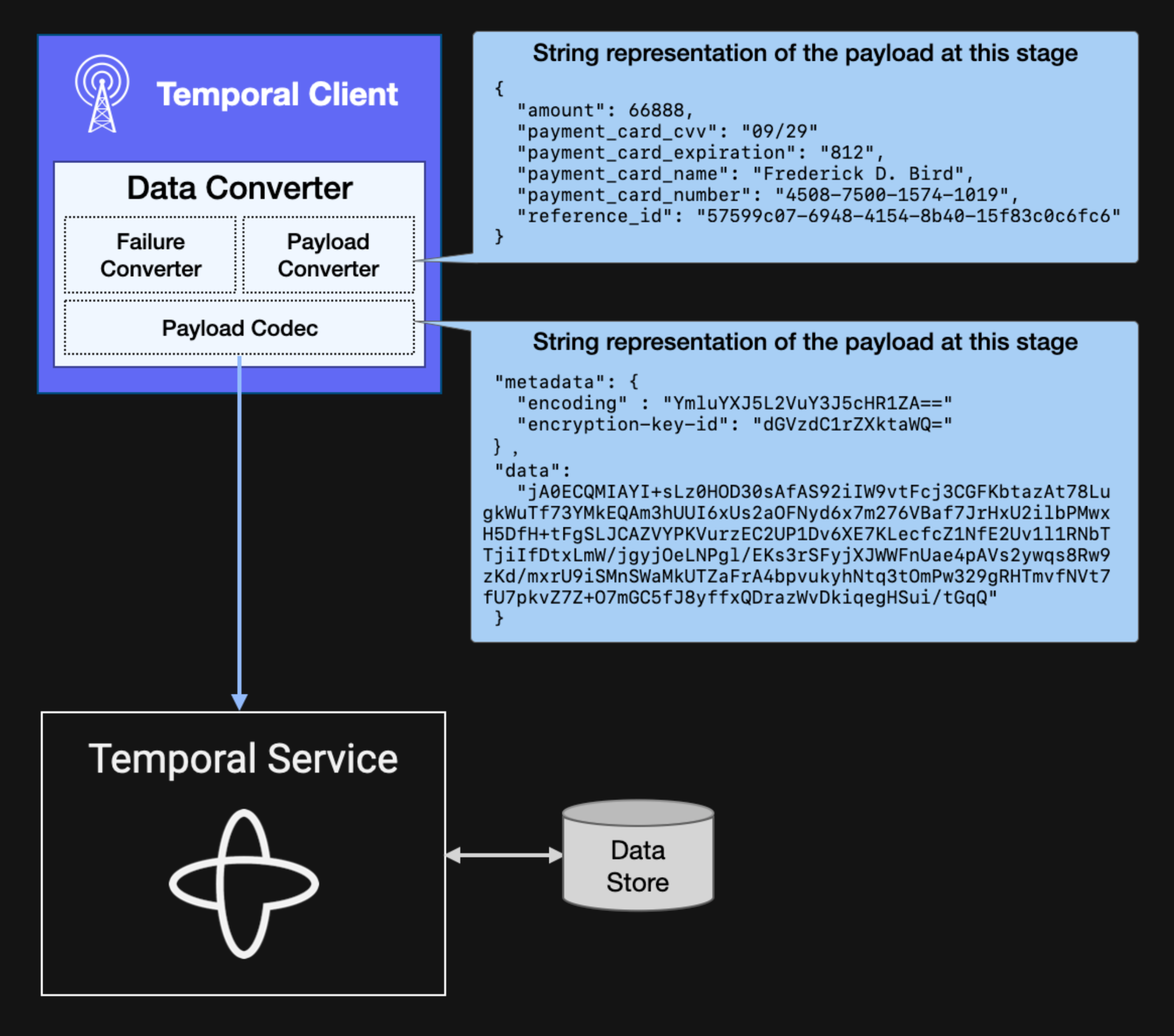 Temporal’s design, which allows a Temporal Client to encrypt payload and failure data before it’s transmitted, ensures that the Temporal Service only ever sees encrypted data. From the perspective of the Temporal Service, this data is just a bunch of bytes. The Client is responsible for decoding those bytes, while the application that uses the Client (such as the Worker) is responsible for interpreting the underlying data.